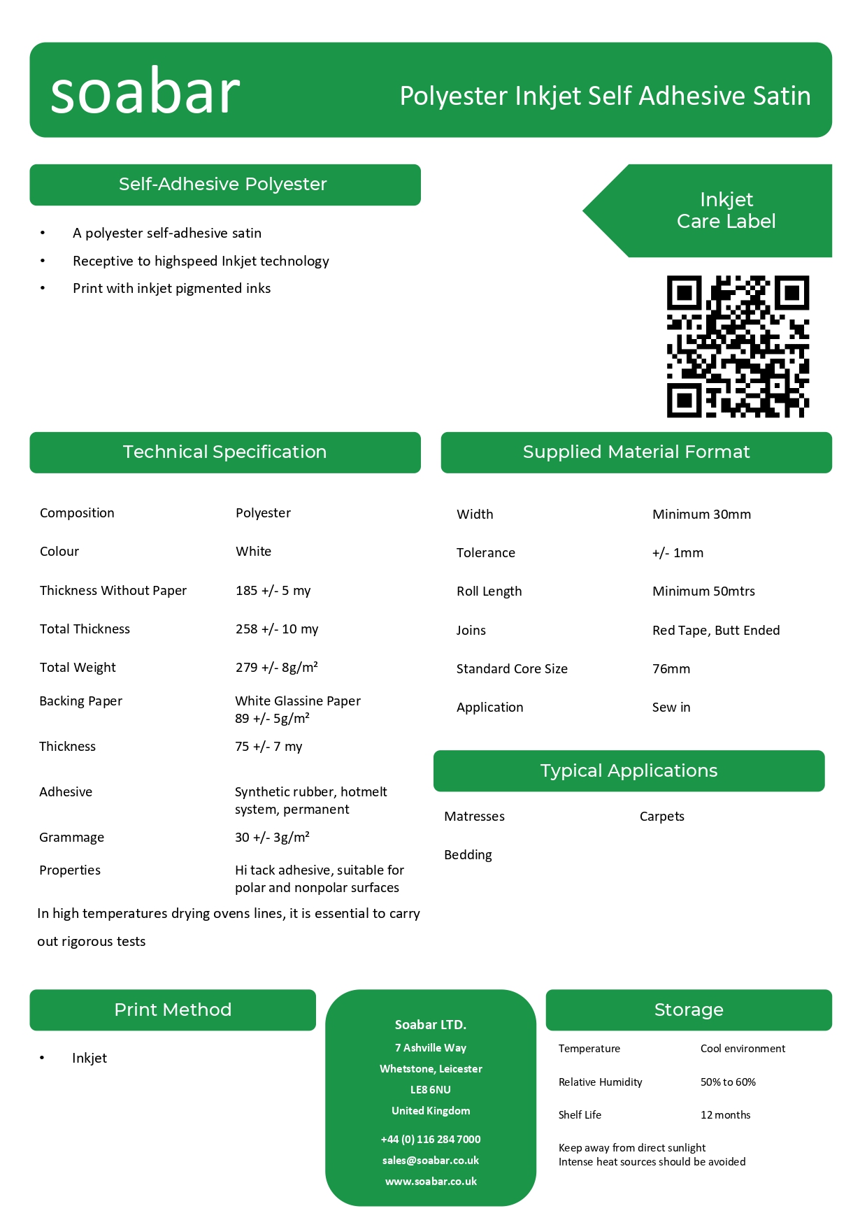 Our INKJET03W material is a polyester satin taffeta with an inkjet receptive coating for use with pigment based inkjet printer such as our 4 colour pigment printer, well suited to producing your own care labels on demand.