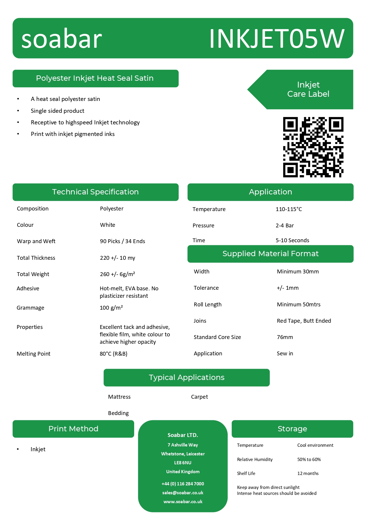 Our INKJET05W material is a polyester satin taffeta with an inkjet receptive coating for use with pigment based inkjet printer such as our 4 colour pigment printer, well suited to producing your own care labels on demand.