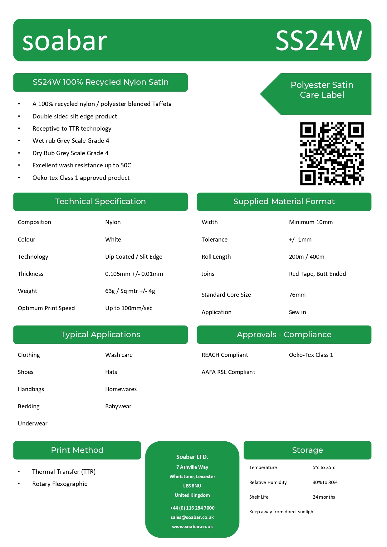 Our SS24W is a premium 100% recycled double sided polyester slit edge satin and is well suited to producing your own care labels on demand for the toughest of environments.