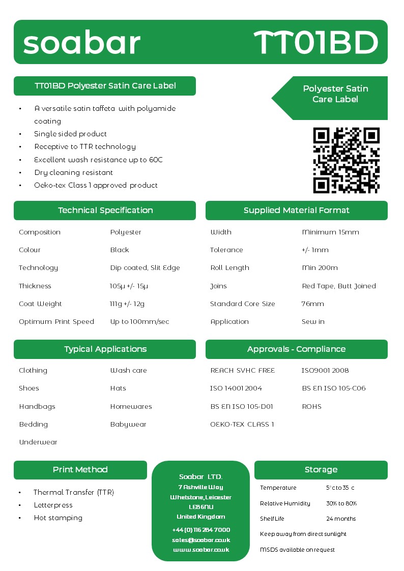 Our TT01BD satin material is a versatile satin taffeta with polyamide coating, well suited to producing your own care labels on demand.