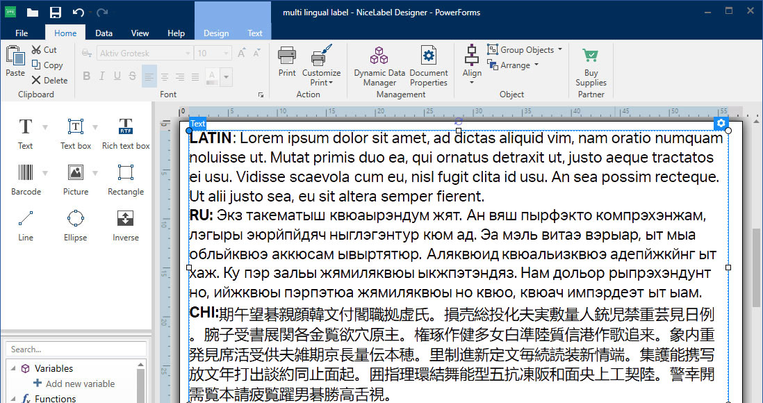 NiceLabel’s user interface, help system and user guides are available in many languages. Label content can by printed in any language with multiple languages appearing on the same label.
